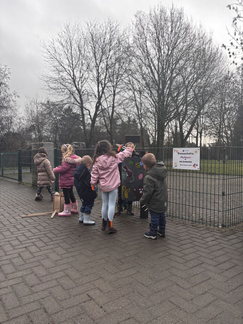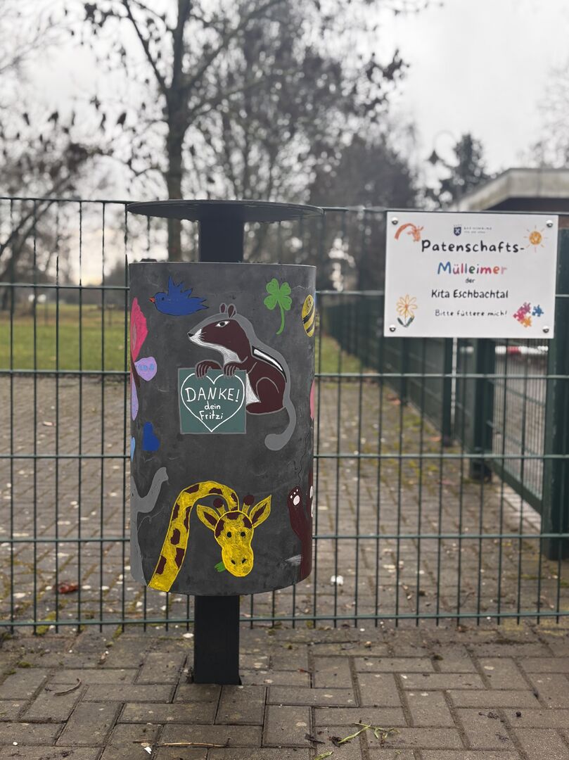 Im Verlauf dieser Aktivitäten wurde deutlich, dass insbesondere der Bereich vor dem Eingang von Kita und Schule zunehmend verschmutzt war – nicht zuletzt, weil dort bislang kein fester Mülleimer vorhanden war. Die Lösung: Das Grünamt stellte einen Mülleimer zur Verfügung, den die Kinder kreativ gestalteten. Anschließend wurde dieser vom Betriebshof fachgerecht einbetoniert. Entstanden ist so nicht nur ein funktionaler Abfallbehälter, sondern ein sichtbares Gemeinschaftsprojekt – und nach Meinung der Kinder „der schönste Mülleimer der ganzen Stadt“.
